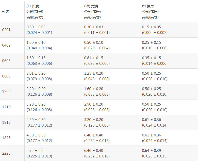 常见贴片电容封装尺寸英制与公制尺寸对照表见如下:
